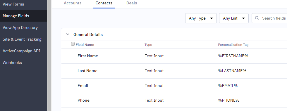 Note that the required fields in ActivaCampaign must be added and the fields will always be sent as type TEXT.