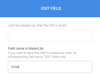 4.You can send form fields to custom fields in MailerLite. Once the list is selected, you should add the corresponding field in MailerLite to each form field's settings: