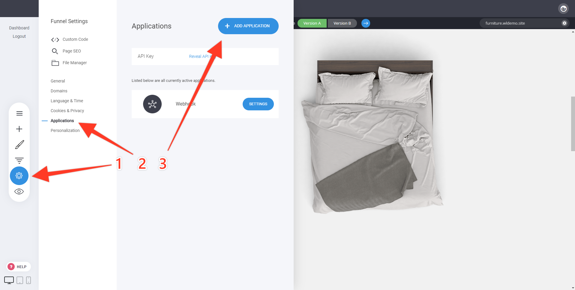 Integrating with AWeber is very easy. To start, navigate to the Applications section in your website or funnel settings and click on Add Application: