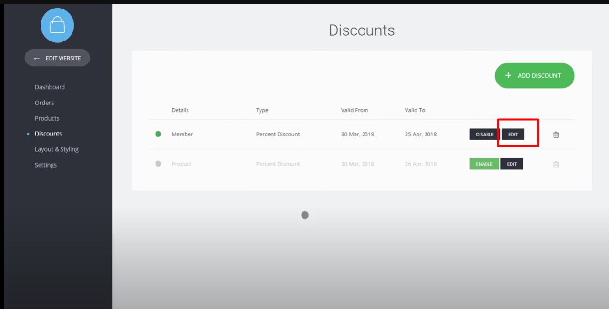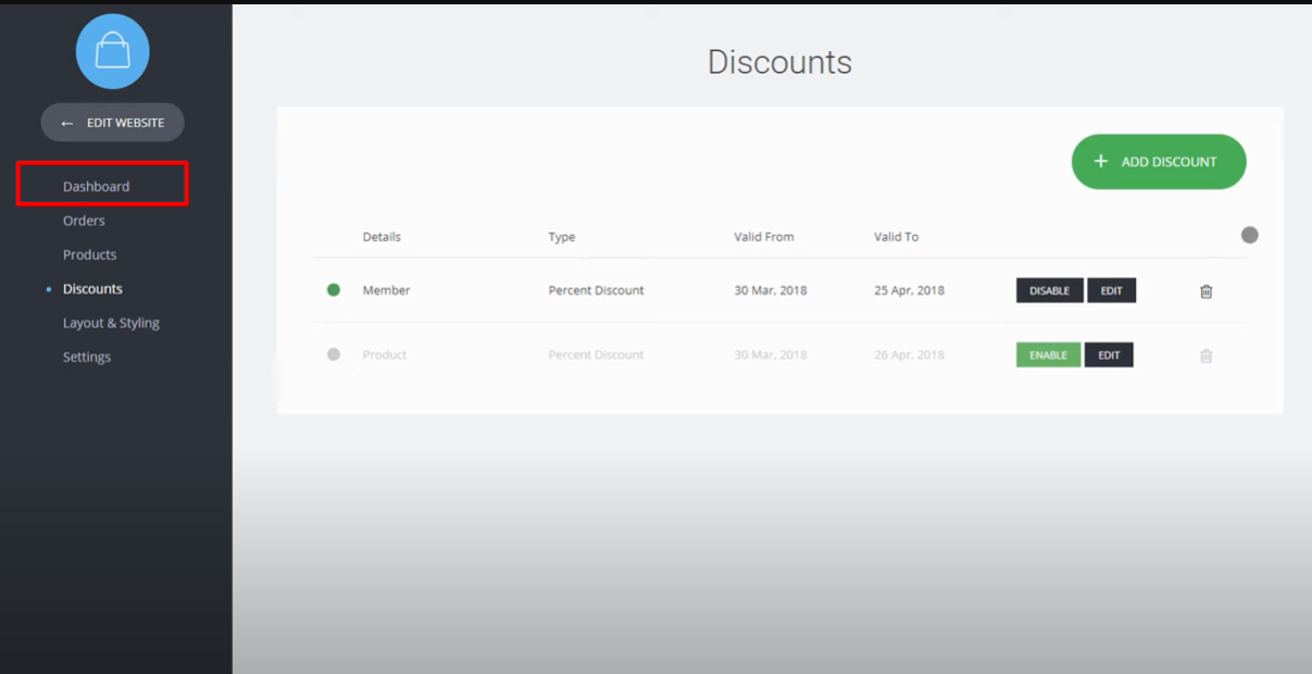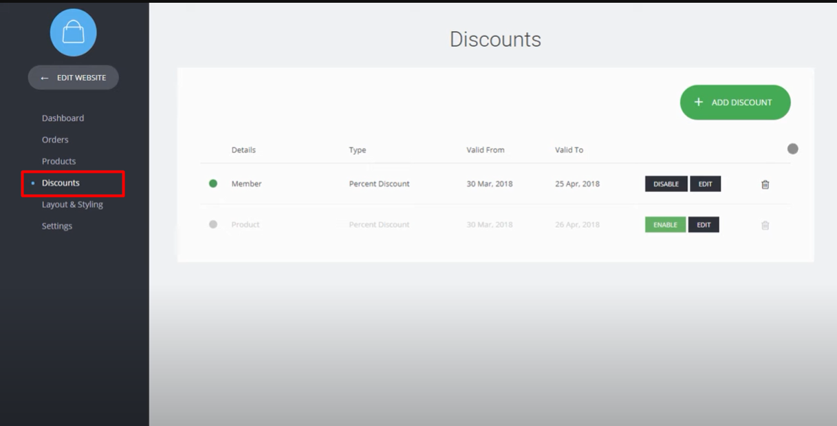 11. Enable or disable discounts: In the discount area, you can see a list of created discounts. If you want to enable or disable a specific discount, locate it in the list and use the corresponding "Enable" or "Disable" button to toggle its status.