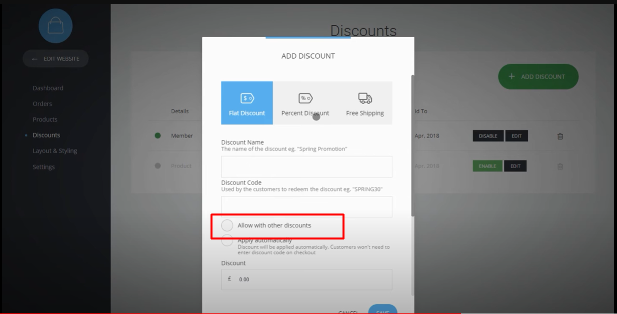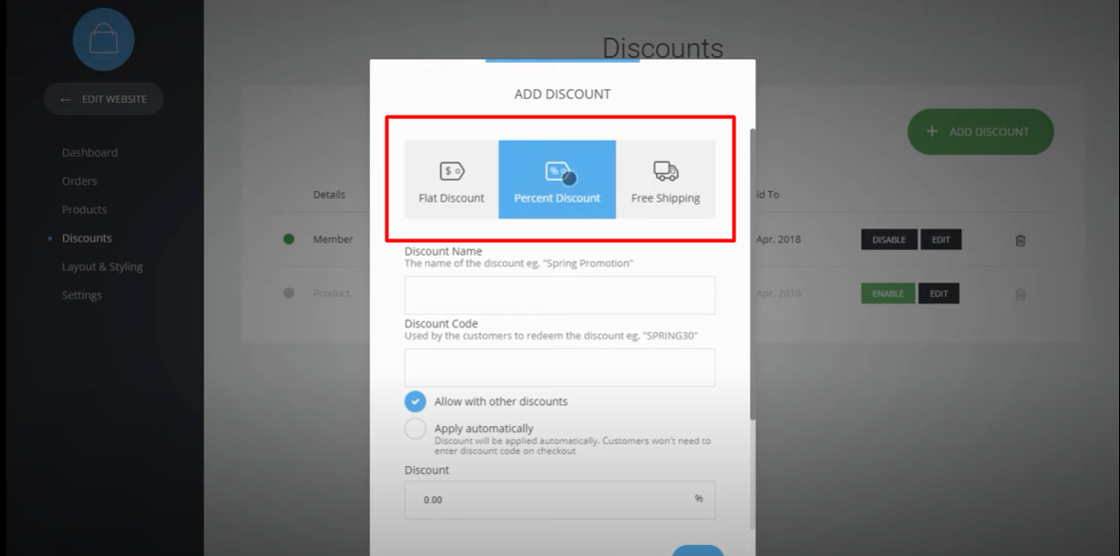 4. Choose the discount type: After clicking "Add discount," you will see three options for the types of discounts you can create: flat, percentage-based, and free shipping. Select the appropriate type based on your requirements.