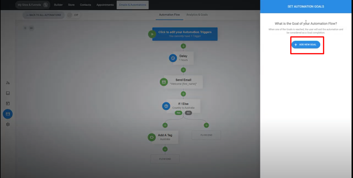 23. Click on "Add New Goal" and select the action that will trigger the goal, such as when a person is tagged with a specific tag.